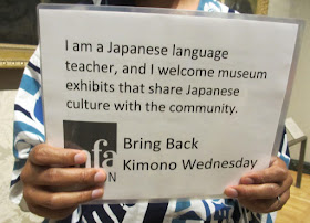 My Thoughts: I can't speak for the counterprotesters but my sense was that they had three main messages: 1: let the MFA know they support Kimono Wednesdays in their original form, 2: ask the MFA to bring back the original Kimono Wednesdays, and 3: let the public know that as Japanese people they don't think it's offensive or racist for non-Japanese people to wear kimono at any time or in any way as demonstrated by the white counterprotesters. Beyond that Timothy very clearly believes that